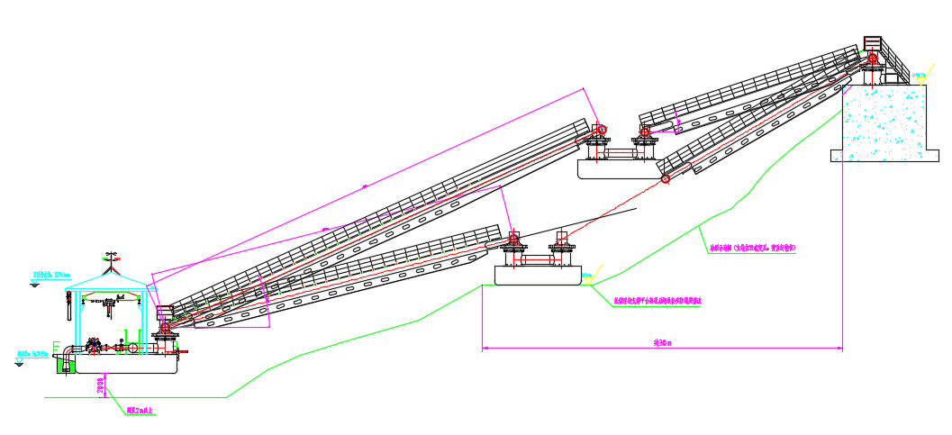 2. 高落差單級(jí)搖臂式固定泵站:適用于取水點(diǎn)水位落差20m~30m較大的,取水點(diǎn)距離岸邊支墩距離 ≤50m的,人行走道雙級(jí)懸橋式安裝場(chǎng)景。其特點(diǎn)是通過(guò)單級(jí)搖臂連接輸水管,結(jié)構(gòu)相對(duì)簡(jiǎn)單,能適應(yīng)較大的水位變化幅度。但對(duì)搖臂的強(qiáng)度和穩(wěn)定性要求高,可在落差較大且水流相對(duì)平穩(wěn)的江河取水,通過(guò)調(diào)整搖臂角度,保證取水口始終處于合適水位。