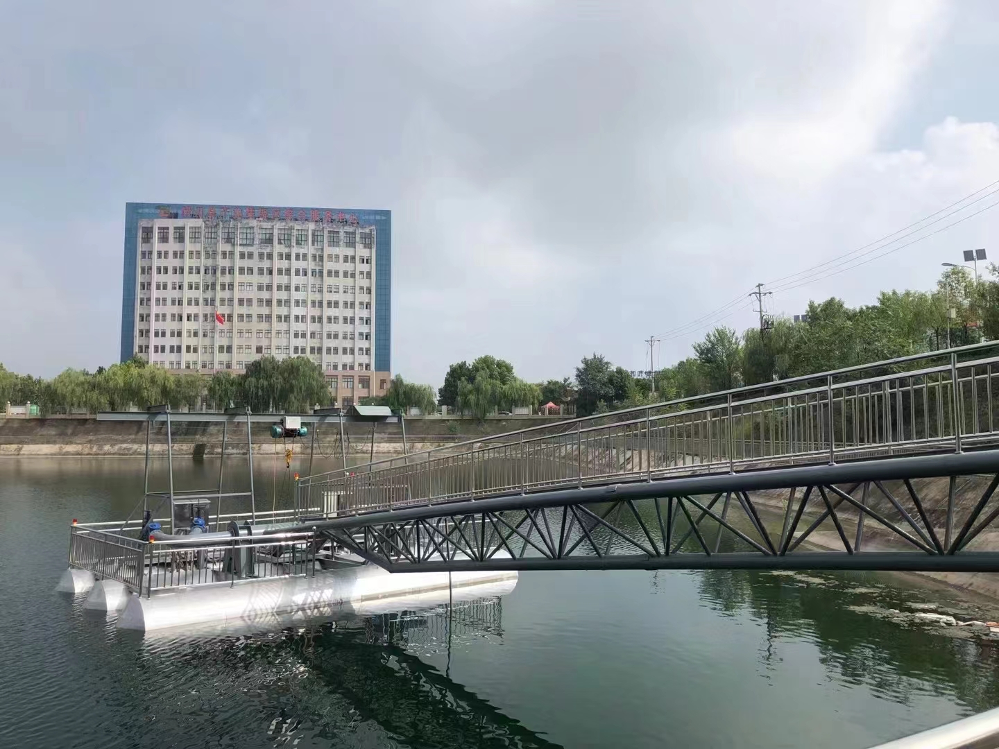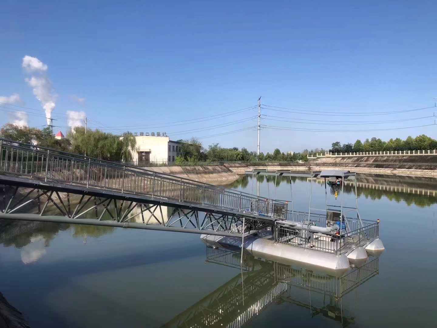 6. 浮橋式泵站:通過(guò)浮橋連接岸邊與泵站主體,輸水管鋪設(shè)在浮橋上,這種結(jié)構(gòu)穩(wěn)定性好,主要適用于水位變化頻率低,流速較慢,風(fēng)速不大,岸坡較平坦的工況。特點(diǎn),浮橋可起到支撐和導(dǎo)向作用,便于輸水管的布置和維護(hù),同時(shí)也方便人員和設(shè)備在岸邊與泵站間通行。